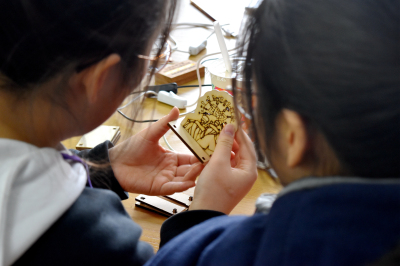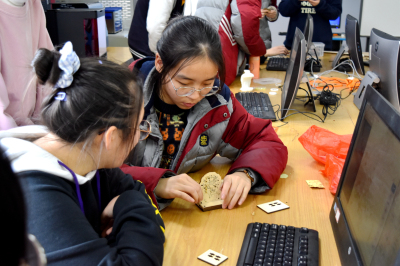 冬令营的主力军是高一中韩部的同学们,他们热情扬溢,投入到亚克力板灯雕的项目创作中。在灯雕设计之初,由于需要设计图纸,而同学们缺少思路,不知道该如何下手。但经过叶敏老师的帮助和引导,同学们马上来了灵感。一张张创造力丰富的图纸提笔就来。同时,新软件和新机器的运用,不仅让同学们增长了知识还提升了学习新事物的能力。